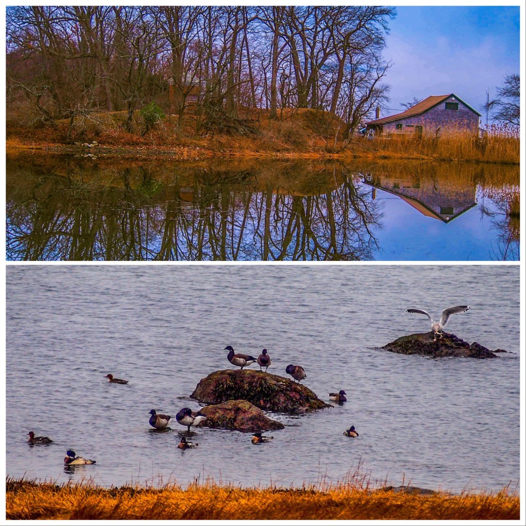 The two scenes below captured on my first walk of 2021, could easily be overlooked. I highly recommend an intentional “pivot and pause.” The top being a perfect reflection of the trees and house in the water. The bottom has the ducks in various conversations and preening while the herring gull caught a fish which he has hanging from his mouth.