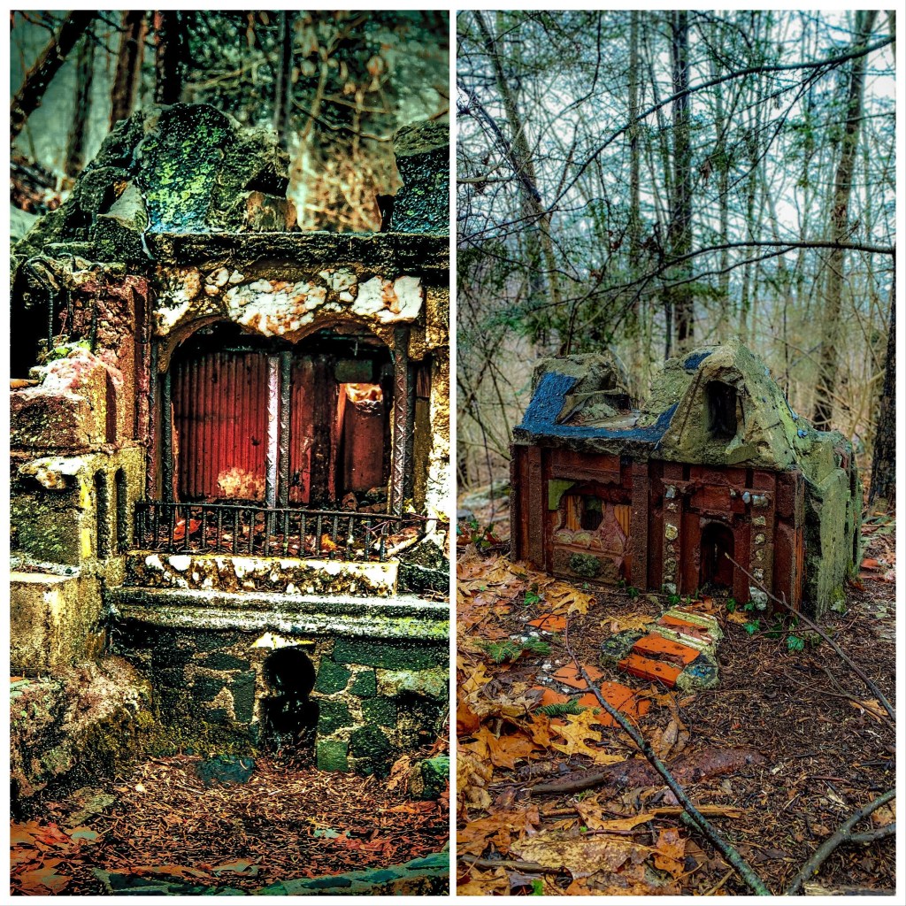 In researching this site there is uncertainty as to its origin but I came across what appears was the final answer. The larger structures were related to an old gas station and the miniature village to what was going to be a plant nursery. So much so that the village houses had electricity intended to light them up in its day. I admit the structures were clearly ornate with stone and iron fencing. Below is a link to a write up.