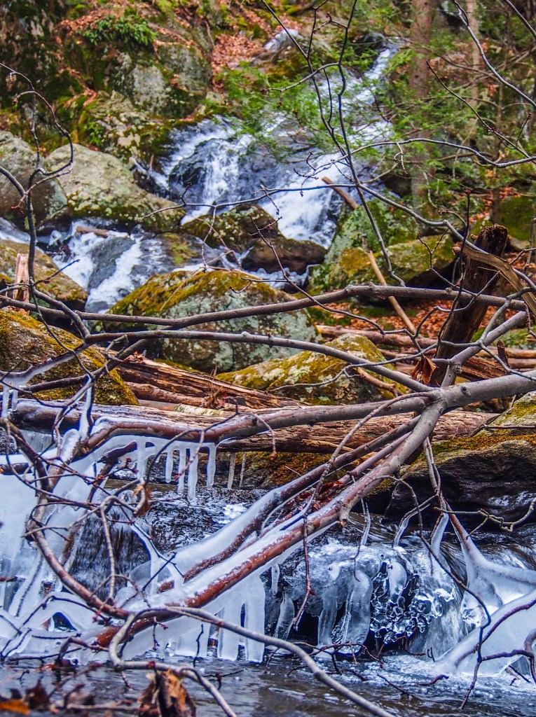 Frozen and icy cascading waterfalls amongst a rocky incline! I am learning where and how to go hiking in the winter. Short hikes to waterfalls is a sound bet.