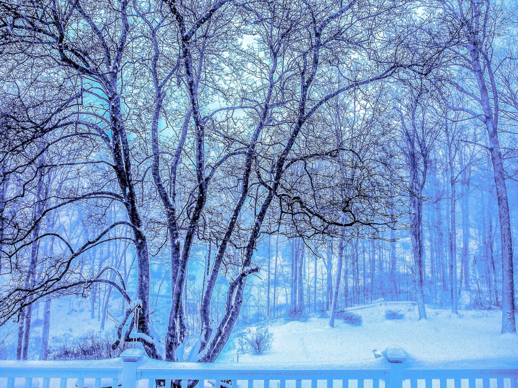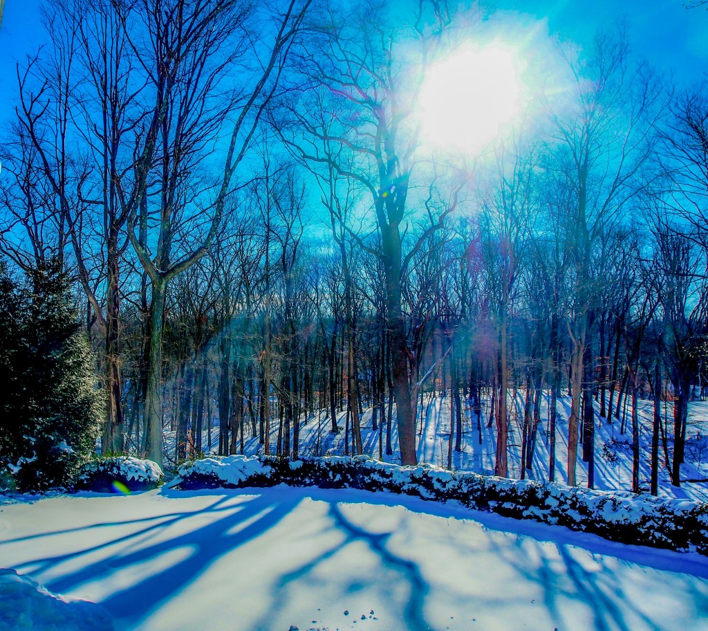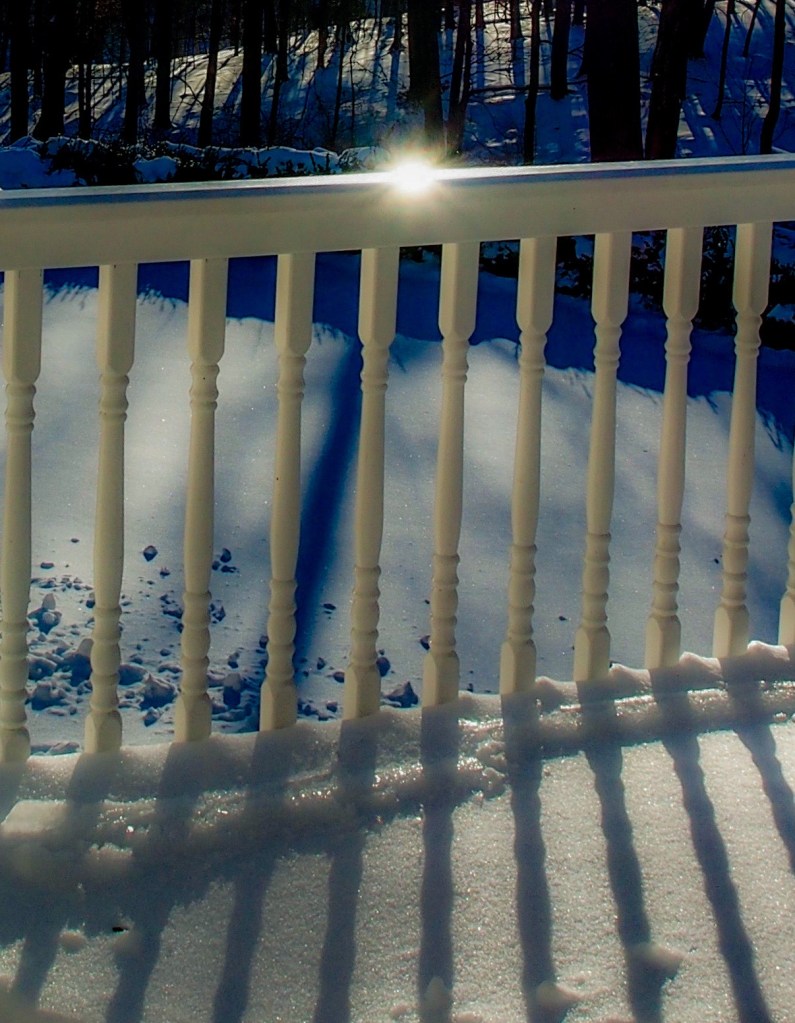 I was distracted from work when the sun finally appeared. The trees cast its shadows on the untouched white drifts.