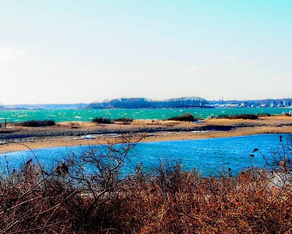First, I take much fewer pictures because it’s so cold. This hike was fun as Bluff Point is a peninsula jutting out onto the sound and has a beach strip that juts out from there. It’s a mile and a half out and back so manageable. But on this day quite muddy with loads of puddles. Many who just wore sneakers had to turn back. I had a mission to get to the fun beach strip as I fell in love with that spot when kayaking there as it divides an inlet from the sound and you can see both sides at the same time.