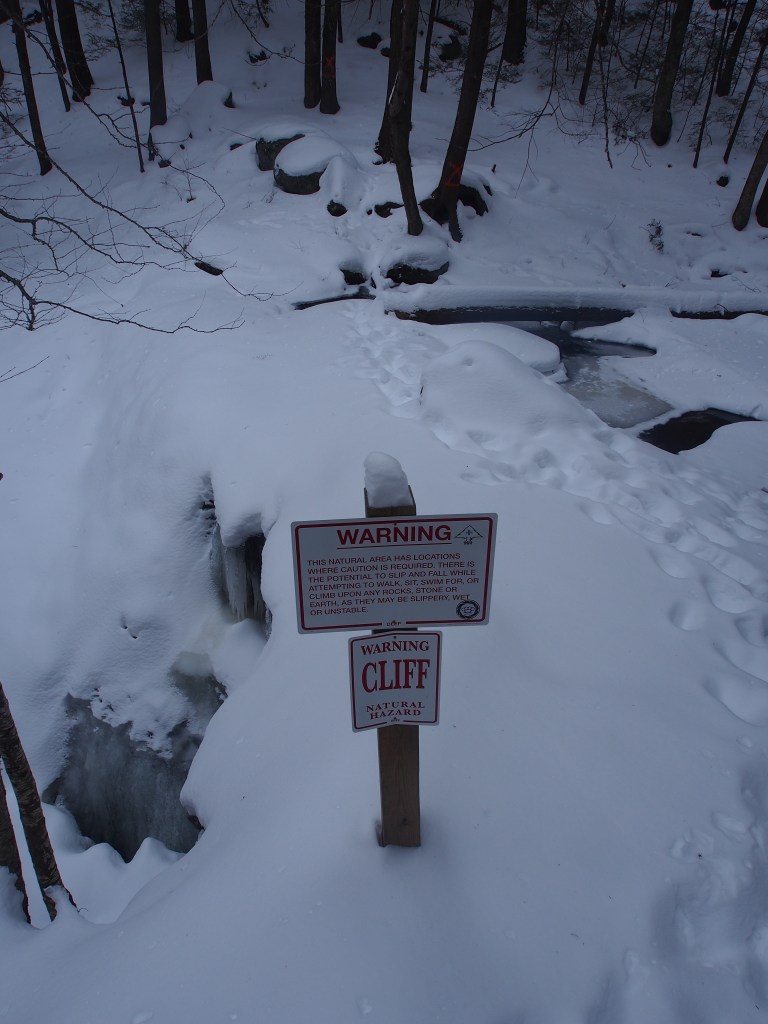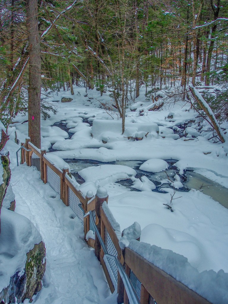 Given the degree of snow, do stay on the path and hold onto the rail. A step off the path can send you down the ravine! Happy winter hiking!
