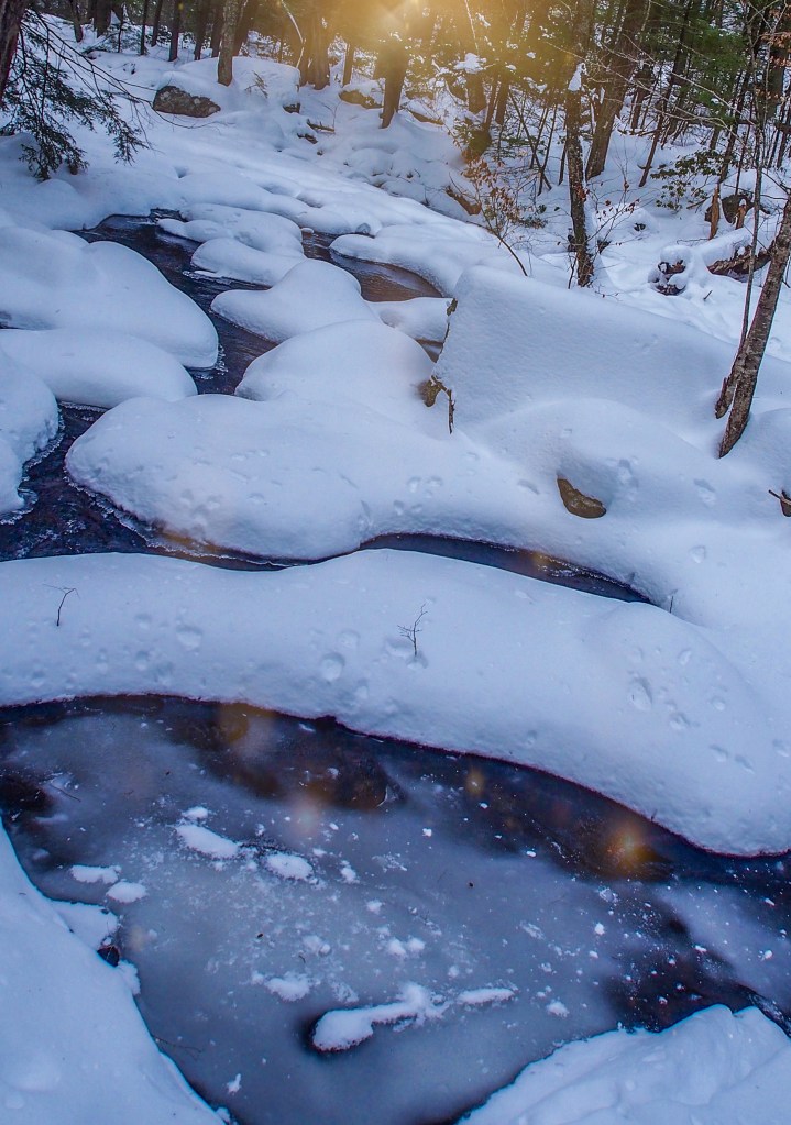 I captured a few seconds of the babbling brook traversing the snow clouds. While others may be focused on the icicles of the falls for some reason this is the spot I found most magical and serene.