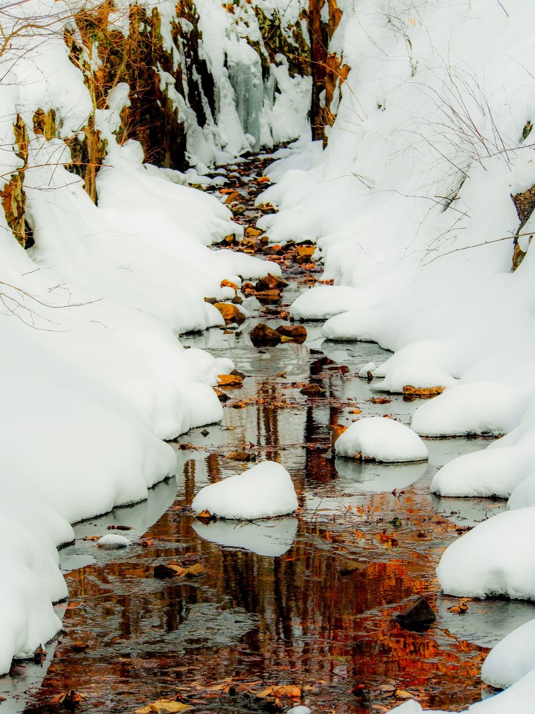 I found a small gorge which appeared may be a small waterfall in season. I took many pictures trying to get both the frozen waterfall and the reflecting snow topped rocks in the stream.