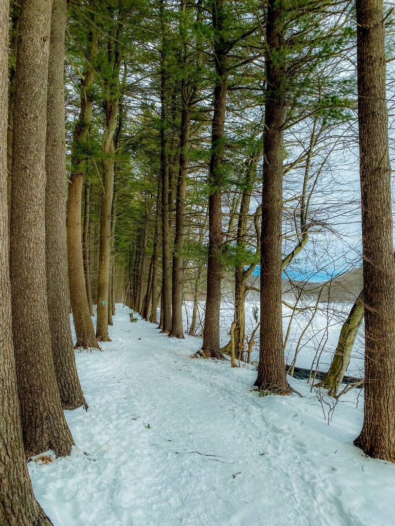 I went down the white trail between the canopy of trees following the lake’s edge which was a blanket of ice and snow. I could see animal footprints of various types on top.