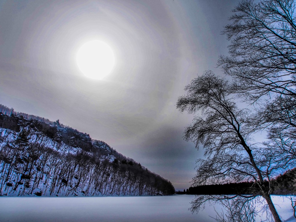 I then returned on the blue trail which provided opportunity to try a bit of elevation in the snow. I was wearing micro spikes so felt I could give it a try. I enjoy peeking through the bare trees finding opportunities to use them as a frame to capture the scene below me.