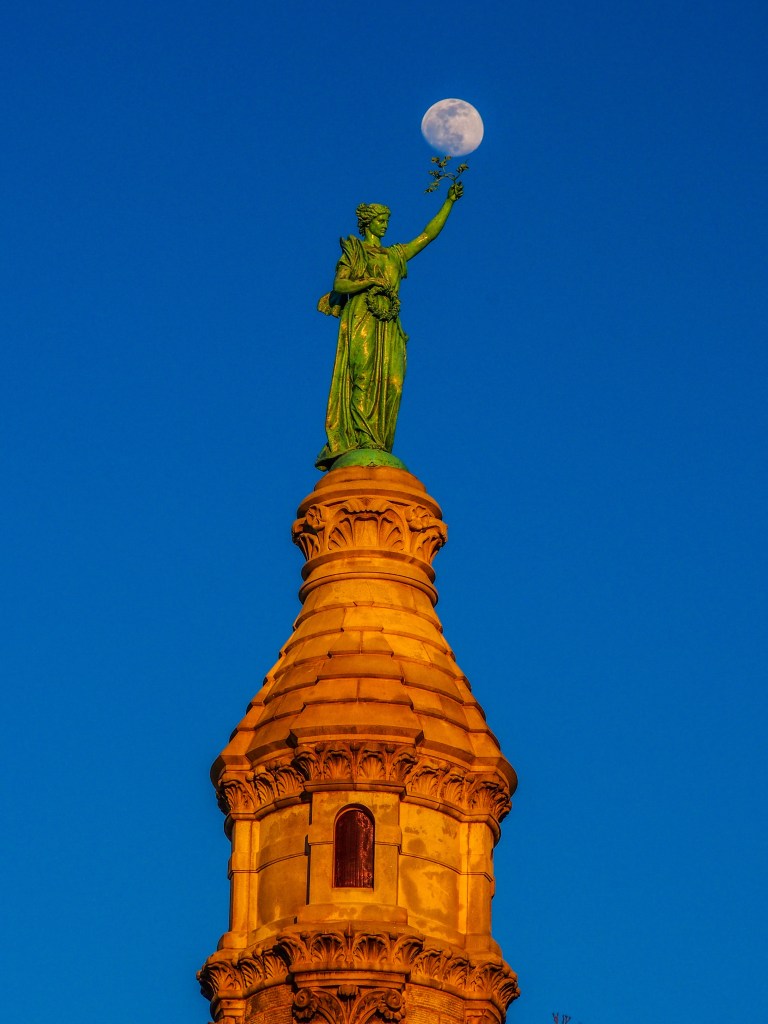 Once at the top I noticed the moon along side the tower. I started to run around the park trying to find the angle where the moon would appear to balance on the top of the statue. So fun to capture the result for forever recall.