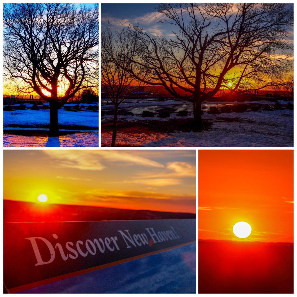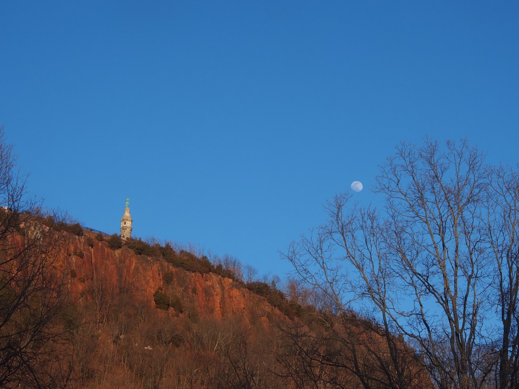 A 50 degree day after weeks of snow motivated me to take a drive to East Rock to check out the Eli Whitney museum waterfall and the Giant Steps to the summit. Boy was I rewarded with a perfect sun and moon evening!