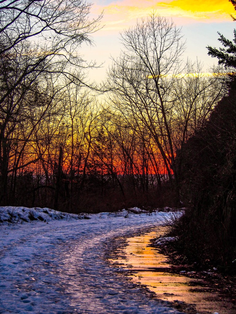 The climb down was lovely as well with the sun’s colors shining onto the road. I was rushing to get down before the sun set but had to pause when I saw the colors in the backdrop of the snow and icy road!