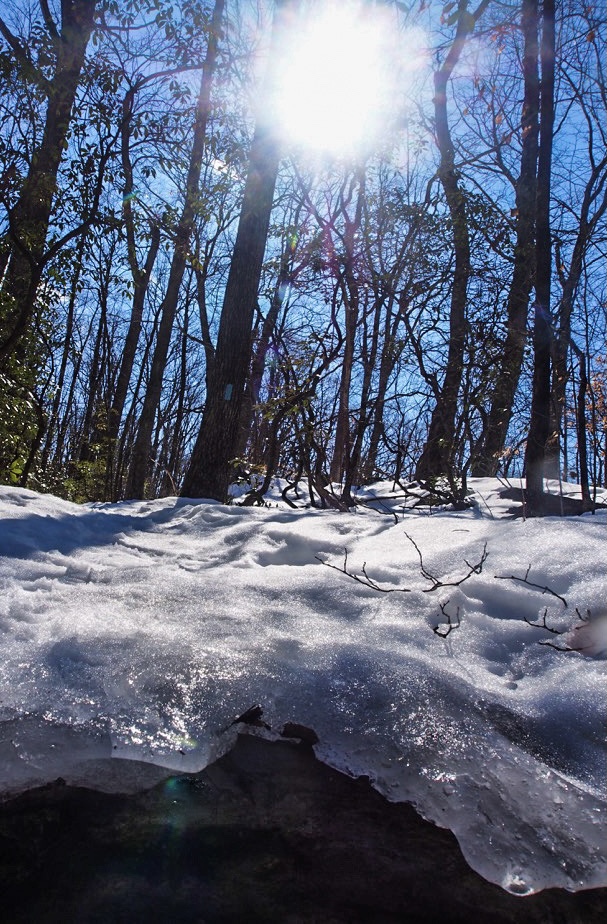 Many of the paths crossed brooks that were narrowed by the snow and ice. I sat on the edge of the water in my snow pants to capture a picture from below the ice up to the shadowy path. It was fun trying to ensure that you didn’t step on snow and ice that would otherwise fall straight into the Brook!