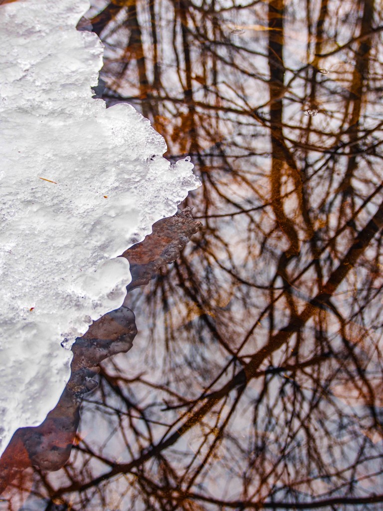 While it may not have a waterfall, an overlook or ruins, it was a lovely hike where I focused on the thawing ice and forest reflections.