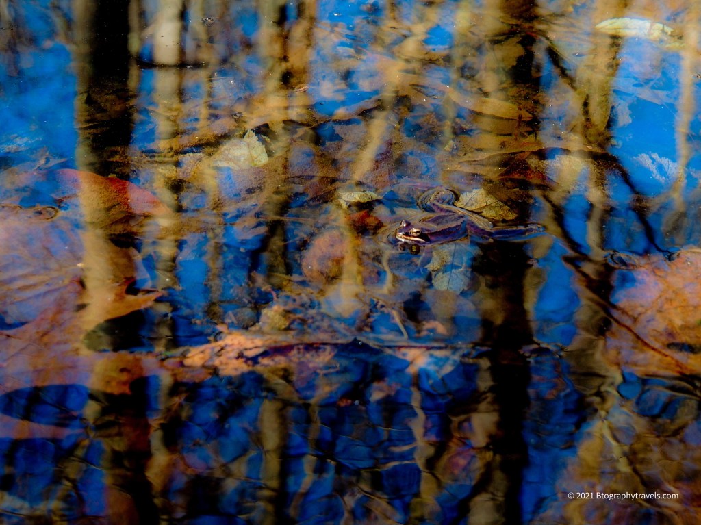 Not far into the trail I heard loud nature sounds in the marsh. As a NYC gal it took some deduction to realize it was frogs mating! Hundreds of them hiding throughout the water and in and around the logs and leaves. I took a short video clip for recall below and got only one decent picture of a frog. I literally saw about six on top of one another!