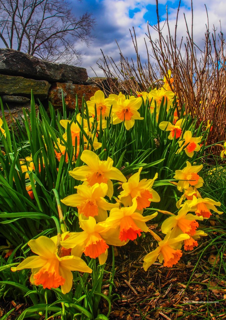 While I have not learned all the names of the trees and plantings, I can share that there are fields of daffodils around that complement the scene of the duck pond, bridges and blooming trees.