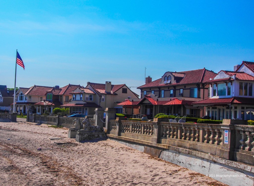 Per the New York Times, the Villa Rosa, a gated peach-stucco mansion built by Sylvester Poli, a theater-chain owner, in 1910. Lining a cove behind it are 10 similarly styled homes, built for Mr. Poli’s daughters and grandchildren, whose red-tile roofs recall the Mediterranean Riviera.