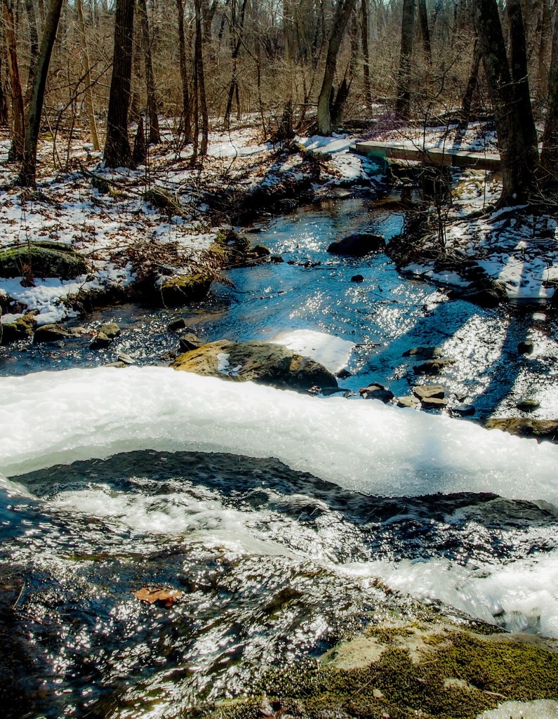 I found a small gorge which appeared may be a small waterfall in season. I took many pictures trying to get both the frozen waterfall and the reflecting snow topped rocks in the stream.